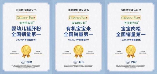 近日,“爷爷的农场”发文称,作为辅食喂养赛道的中坚力量,“爷爷的农场”凭借着在食品领域的精耕,在5月再次收获CIC灼识咨询颁发的三大权威市场地位确认证书,分别是:“婴幼儿猪肝粉全国销量第一(以2024年销售额计)”“有机宝宝米全国销量第一(以2024年销售额计)”“宝宝肉松全国销量第一(以2024年销售额计)”,品牌影响力得到进一步提升。