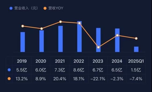 但怎么说呢,市值风云吾股大数据的两张图就能足以概括,2020年易明医药的收入是6个亿,2024年是6.5亿,2025年一季度下滑7.4%,作为利润的源泉,医药医药近年来收入基本原地踏步。