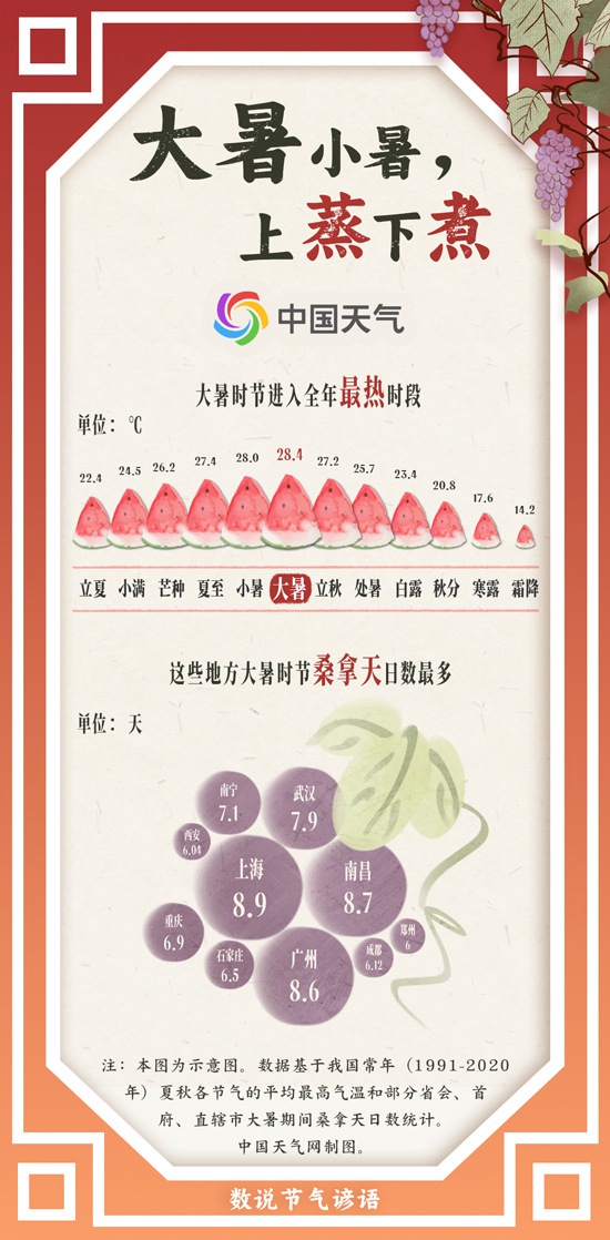 中国天气网盘点1991年至2020年的大数据发现,大暑节气全国平均气温在二十四节气中最高,平均高温日数最多,极端高温出现次数也最多,是名副其实的炎热“三料冠军”。在南方的江汉、江南、华南北部和北方的青海东部、甘肃、内蒙古中部、东北地区东南部等地,历年的最高气温极值纪录都出现在大暑节气。