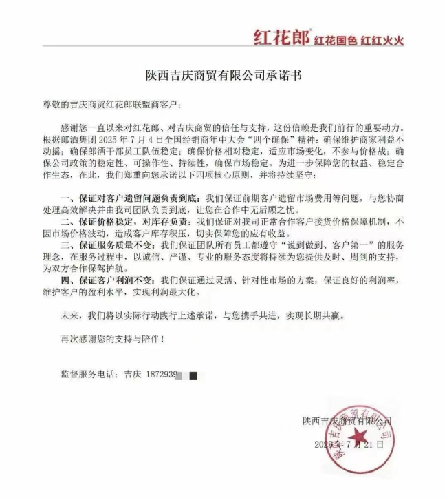 陕西吉庆商贸有限公司致联盟商在自发发起的《承诺书》中提到,根据郎酒全国经销商年中大会的“四个确保”精神,吉庆商贸向联盟商承诺“四项核心原则”,如“保证价格稳定,对库存负责”“保证服务质量不变”等;