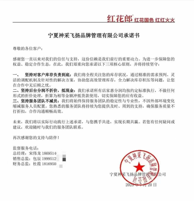 宁夏神采飞扬品牌管理有限公司的《承诺书》同样态度坚决,表态将“坚持对客户库存负责到底;坚持后台分润不折价,抵现金;坚持服务团队不减员”。