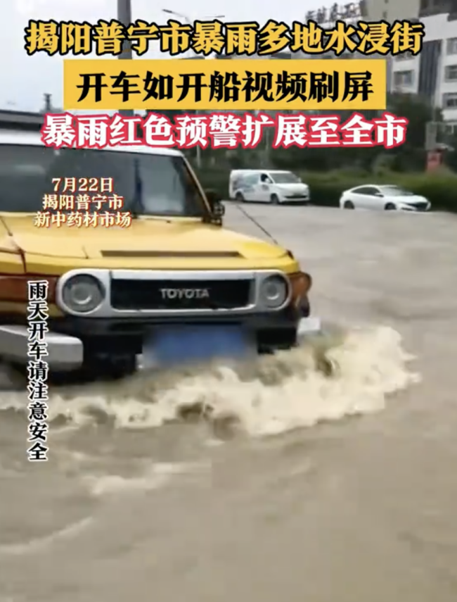 广东普宁暴雨多地水浸街 开车如开船
