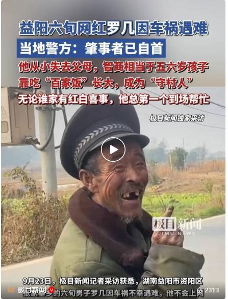 9月23日,湖南益阳市资阳区张家塞乡的六旬男子罗几因车祸不幸遇难。据了解,罗几今年六十多岁,从小失去父母,智商仅相当于五六岁的孩子,靠吃“百家饭”长大。当地居民介绍,9月20日晚,罗几在路上溜达时被车撞倒,但没有人注意到,第二天早晨才有街坊发现他。由于耽搁了一晚上,送到医院时人已经快不行了,最终他于9月22日上午去世。
