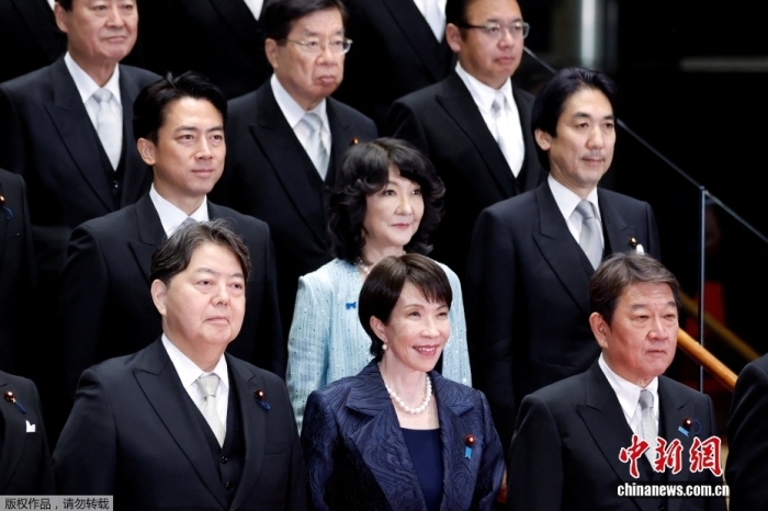 当地时间10月21日晚,日本新任首相、自民党总裁高市早苗组建新内阁,标志着由自民党和日本维新会组成的执政联盟正式启动。图为日本首相高市早苗(第一排中)在东京的首相官邸率阁僚合影。