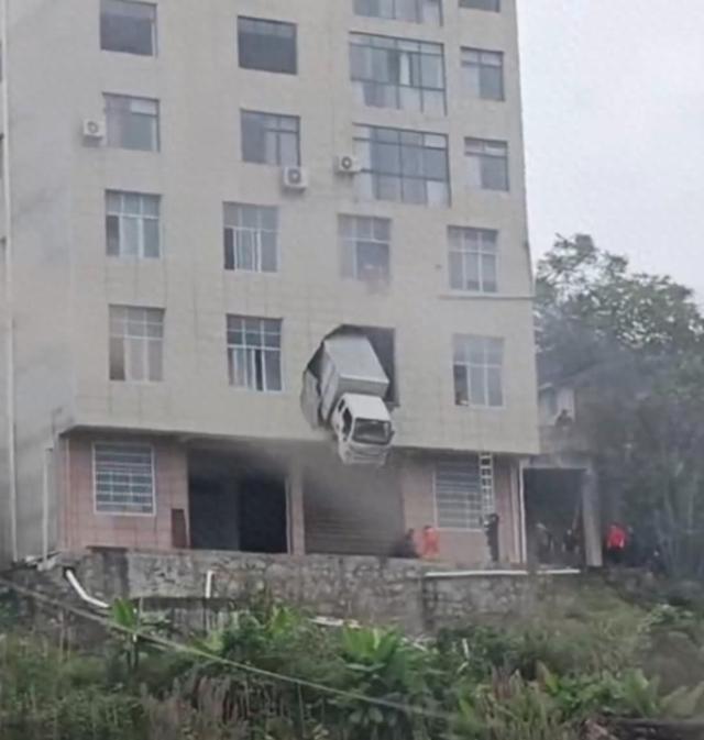 一货车撞破楼房墙体车身悬空险坠楼,当地回应 未造成人员伤亡