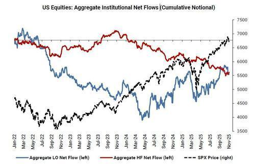 高盛交易部门观察到,当前的市场结构为潜在的逼空行情埋下了伏笔。尽管近期股指表现疲软,标普500指数期货的未平仓合约却增加了210亿美元,显示出市场新增了多头头寸。此外,市场仓位数据显示出明显分歧。在过去四周里,长线机构投资者持续净卖出,累计规模约80亿美元,而对冲基金则在此期间录得18亿美元的净买入。
