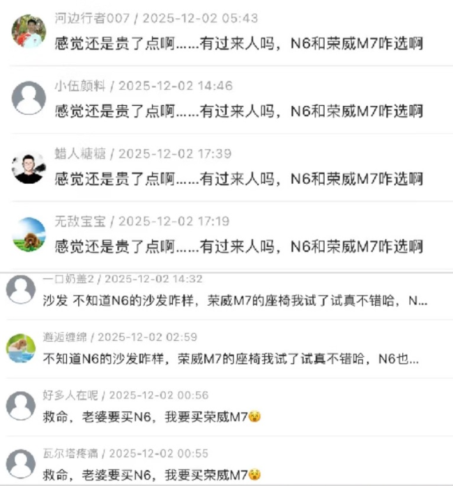 比如其举例的截图中显示的评论:“救命,老婆要买N6,我要买荣威M7。”“不知道N6的沙发咋样,荣威M7的座椅我试了试真不错哈。”“前有荣威M7打样,后有N6跟进,10万预算国产还是合资呢?”“N6参数和荣威也太像了,英雄所见略同?”“N6续航1300,M7能到2000+,国产混动技术蛮厉害的。”