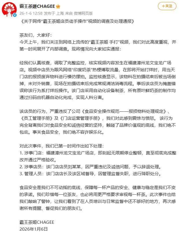 近日,一段关于“霸王茶姬店员徒手操作”的视频在网络上广泛传播,引起公众关注。1月6日,霸王茶姬官方发布了调查及处理通报,称该视频是在福建漳州一门店内拍摄的摆拍视频,所用物料为报损废弃品,并未对外销售。涉事门店已被无限期停业整顿。