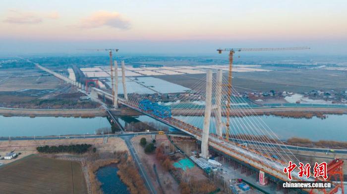 中新网南京1月9日电 (记者 朱晓颖)8日傍晚,新建上海至南京至合肥高速铁路(简称“沪宁合高铁”)控制性工程——沪宁合高铁南京特大桥跨滁河斜拉桥合龙,桥梁跨越数百米水域实现“精准牵手”。这标志着该斜拉桥主体工程全面完工,转入桥面系施工阶段。