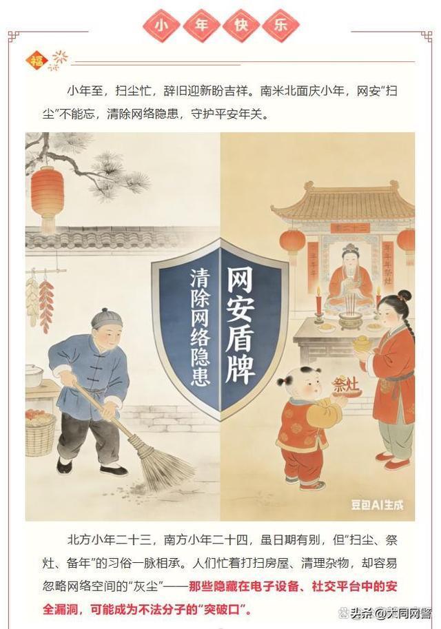 公安网警提醒,小年扫尘不仅要清理环境,还要保护网络安全。在处理旧电子设备前,使用专业工具彻底销毁数据;在社交平台晒图时,注意隐藏敏感信息;网络购物时坚持“官方渠道、货到付款、不私转”的原则。及时清除网络隐患,让年关更加安心。无论南北方的小年,平安无差别。希望大家扫去尘埃,守住网络安全,欢欢喜喜迎接新春。