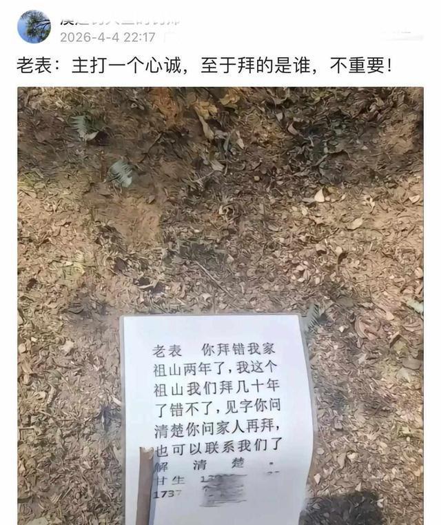 拜错祖坟2年当事人发声 温情化解误会!三月三十日,江西一个村子传出了一条特别的消息:有人连续两年清明节都到同一座坟前祭拜,直到今年才发现自己认错了祖坟。墓主家没有生气也没有张扬,在坟头贴了一张手写的纸牌,上面写着“老表你拜错我家祖山两年了”,还特意加了一句,“问清楚家人联系我们核对详情”,语气像邻居间的闲聊。