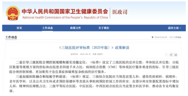 国家卫健委《三级医院评审标准(2025年版)》进一步明确导向,引导三级医院合理控制规模,聚焦急危重症与疑难复杂疾病诊疗,并要求三甲综合医院等设置全科医学科,推动各专业均衡发展。