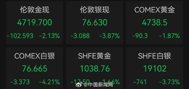 贵金属方面,伦敦现货白银跌3.87%报76.63美元/盎司,现货黄金跌2.13%报4719.10美元/盎司;COMEX白银期货跌4.21%报76.665美元/盎司,COMEX黄金期货跌1.87%报4738.5美元/盎司。
