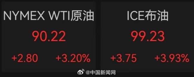 截至当地时间21日收盘,WTI原油期货涨3.20%报90.22美元/桶,盘中涨幅一度超过5%;布伦特原油期货涨3.93%报99.23美元/桶,盘中一度涨超6%站上100美元。