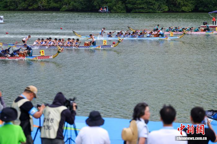 图为参加男子组12人龙舟100米直道赛的队伍在半决赛中。中新社记者 骆云飞 摄