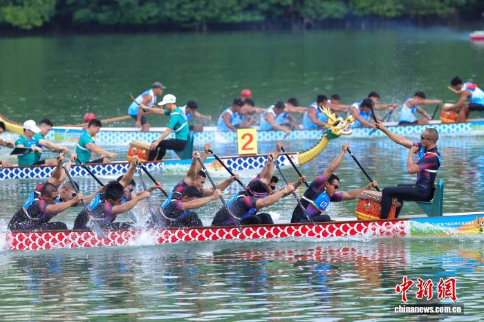 图为参加男子组12人龙舟100米直道赛的队伍在预赛中。中新社记者 骆云飞 摄