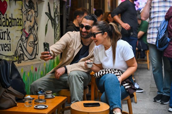 2025年11月22日,顾客在土耳其伊斯坦布尔的曼达巴特马兹咖啡店外合影。新华社记者刘磊摄