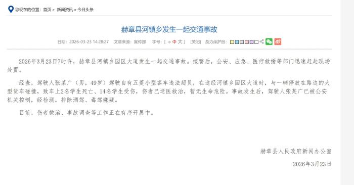 中新网贵阳3月23日电 (记者 周燕玲)贵州省赫章县人民政府新闻办公室23日对外发布通报称,23日7时许,赫章县河镇乡园区大道发生一起交通事故,致车上2名学生死亡、14名学生受伤,伤者已送医救治,暂无生命危险。
