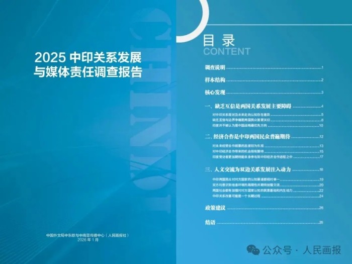 1月16日,《2025中印关系发展与媒体责任调查报告》正式发布。本次民调由中国外文局中东欧与中南亚传播中心(人民画报社)与印度著名智库全球南方地缘经济中心、上海国际问题研究院南亚研究中心联合开展,自2