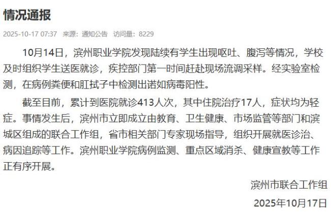 10月14日,滨州职业学院发现学生陆续出现呕吐、腹泻等症状。学校迅速组织学生就医,并联系疾控部门进行现场调查和采样。实验室检测结果显示,病例粪便和肛拭子中诺如病毒呈阳性