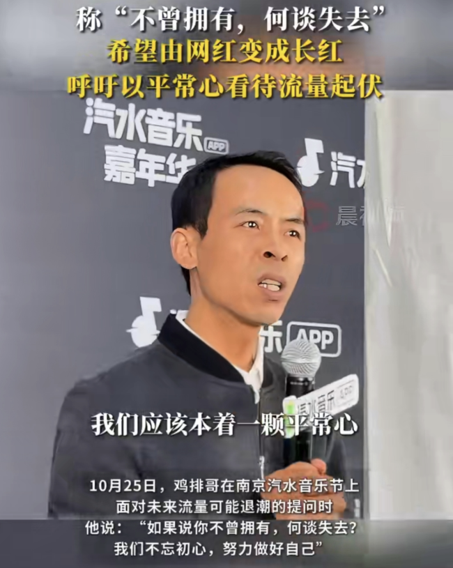 10月25日,“鸡排哥”出现在南京汽水音乐节上。当被问及未来流量可能退潮的问题时,他表示:“如果说你不曾拥有,何谈失去?我们不忘初心,努力做好自己。”他承认自己并非富豪,但将百万粉丝视为无价的精神财富,并呼吁大家以平常心看待流量的起伏