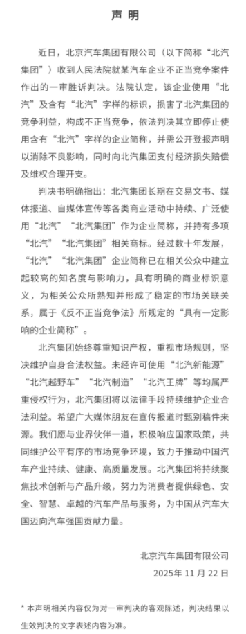 北汽集团的胜诉比想象中更彻底一点。