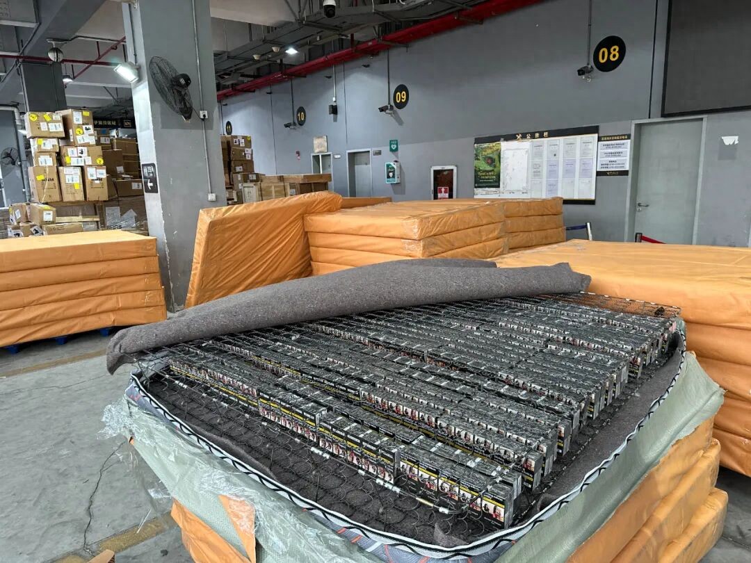 出口床垫内藏95万支走私香烟被查。近日,莲塘海关在货运出口渠道查获夹藏走私香烟4796条。海关关员在对一批以一般贸易方式申报出口的“床垫”进行查验时,发现该批床垫机检图像异常,图像显示该批床垫内部有整齐排列的矩形物体,疑似有夹藏物品,随即扩...