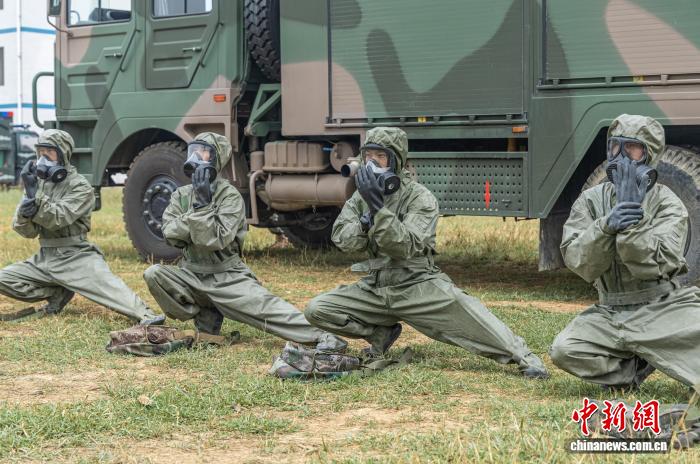 图为防化分队官兵正在穿戴防护衣。何家龙 摄 图为防化分队官兵正在对“染毒”地带进行毒剂侦检。何家龙 摄