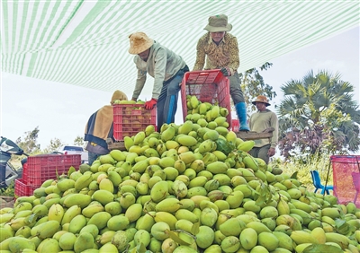 在柬埔寨磅士卑省的一处集中收购站,果农们正在卸载芒果。  本报亚太中心分社乔恩·提亚拉摄  走进第八届进博会国家综合展柬埔寨国家馆,新鲜硕大的芒果和浅黄透亮的芒果干整齐码放,散发出浓郁的果香,吸引