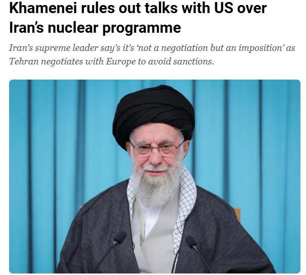中新网9月24日电 综合卡塔尔半岛新闻网和阿拉比亚新闻网报道,当地时间23日,伊朗最高领袖哈梅内伊表示,与美国进行谈判不符合伊朗的利益,最终只会走入“死胡同”。