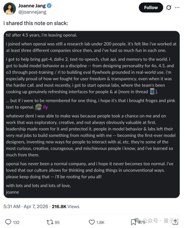 Joanne Jang,被称为GPT-4o的灵魂工程师,宣布结束在OpenAI四年半的工作。她在一篇长文中表示,离开OpenAI后将不再解释原因或透露下一步计划